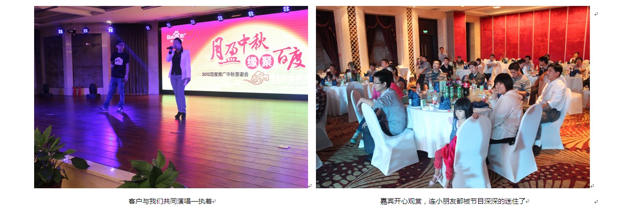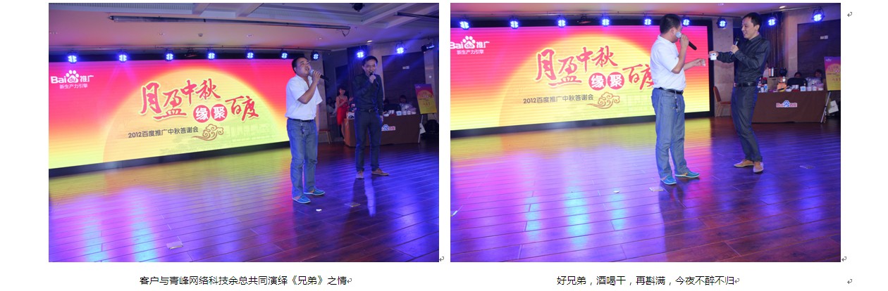 在這個秋月朗照,丹桂飄香的夜晚,我們匯聚四面八方的歡歌笑語,舉辦了一場完美的感恩盛宴?;顒蝇F(xiàn)場,新鄉(xiāng)企業(yè)家朋友按捺不住他們與百度合作的熱情,紛紛與自己的百度客服人員分享百度推廣的心得體會,甚至與我們的百度客服同事聯(lián)袂登臺獻歌,表達(dá)自己的感激之情。一曲《執(zhí)著》,一曲《兄弟》,表達(dá)了對百度推廣的“執(zhí)著之心”,與百度推廣的“兄弟之情”。