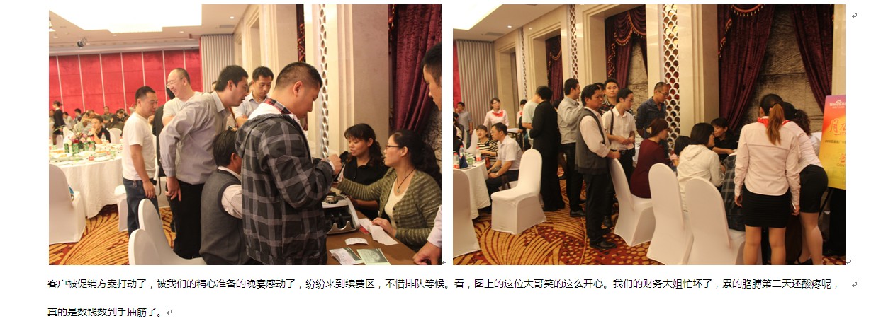 本次活動,舞臺背景使用大屏幕LED,效果絢麗多彩??蛻糇郎暇臄[放了啤酒、飲料、礦泉水、月餅、小點心、酸奶等飲食,還用心準(zhǔn)備了餐巾紙。會務(wù)人員安排井然有序,游戲環(huán)節(jié)新穎勁爆,促銷政策激動人心,續(xù)費抽獎火熱爆棚、熱烈的客戶互動、真誠的客戶感言。無論是酒店檔次,舞臺效果還是節(jié)目的精彩程度都讓在場的客戶朋友們充分感受到了新鄉(xiāng)百度人的熱情和真誠。