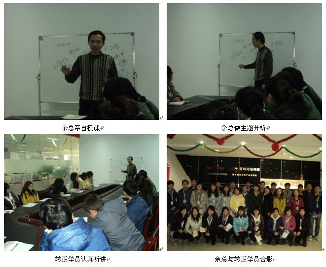 2011年12月17日上午10點,新鄉(xiāng)青峰網(wǎng)絡第三期轉(zhuǎn)正培訓如期舉行,青峰網(wǎng)絡總經(jīng)理余進先生親自為轉(zhuǎn)正的新人做培訓,所有參訓人員備受鼓舞。