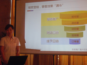 2010年7月21日,新鄉(xiāng)市青峰網(wǎng)絡(luò)科技有限公司:百度實效客戶培訓(xùn)會議——“網(wǎng)絡(luò)產(chǎn)品效果評估”在沁園茶樓成功舉行。客戶在現(xiàn)場積極提問,仔細(xì)分析,認(rèn)真記錄,可以看得出目前互聯(lián)網(wǎng)效果評估對企業(yè)的重要性,也表明了網(wǎng)絡(luò)對于企業(yè)發(fā)展的重要程度?,F(xiàn)場通過精彩紛呈的講演和優(yōu)秀的案例分析,向客戶講解如何對網(wǎng)絡(luò)產(chǎn)品進行有效的效果評估,避免在互聯(lián)網(wǎng)中出現(xiàn)的誤區(qū),讓大家做一個明白的消費者。