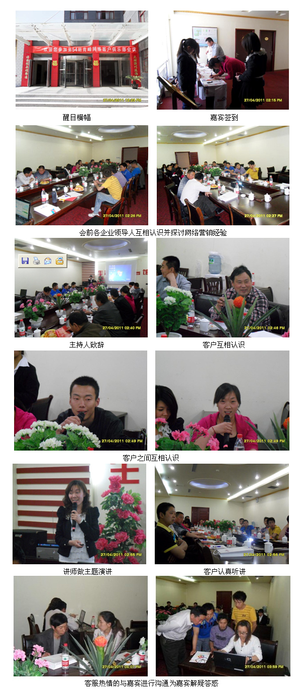 2011年4月27日,青峰網(wǎng)絡(luò)第54期客戶俱樂部活動,在安陽市滑縣溫泉會館如期舉行。下午一點三十分左右,嘉賓陸續(xù)前來簽到。會前,各企業(yè)領(lǐng)導(dǎo)人互相認(rèn)識并探討網(wǎng)絡(luò)營銷經(jīng)驗。會中,網(wǎng)站客服主講梁巍女士從網(wǎng)站基本管理知識,到網(wǎng)絡(luò)營銷與傳統(tǒng)營銷模式的區(qū)別,使客戶充分理解自身在網(wǎng)絡(luò)營銷過程中存在的問題。豐富的客戶案例,更讓客戶認(rèn)識到網(wǎng)絡(luò)營銷在公司整體營銷策略中的重要性,真正讓互聯(lián)網(wǎng)營銷幫企業(yè)創(chuàng)造價值。會后,客服和客戶悉心交流,幫助客戶解決了再網(wǎng)絡(luò)營銷中遇到的實際問題,并進一步拉近了客服與客戶之間的關(guān)系。