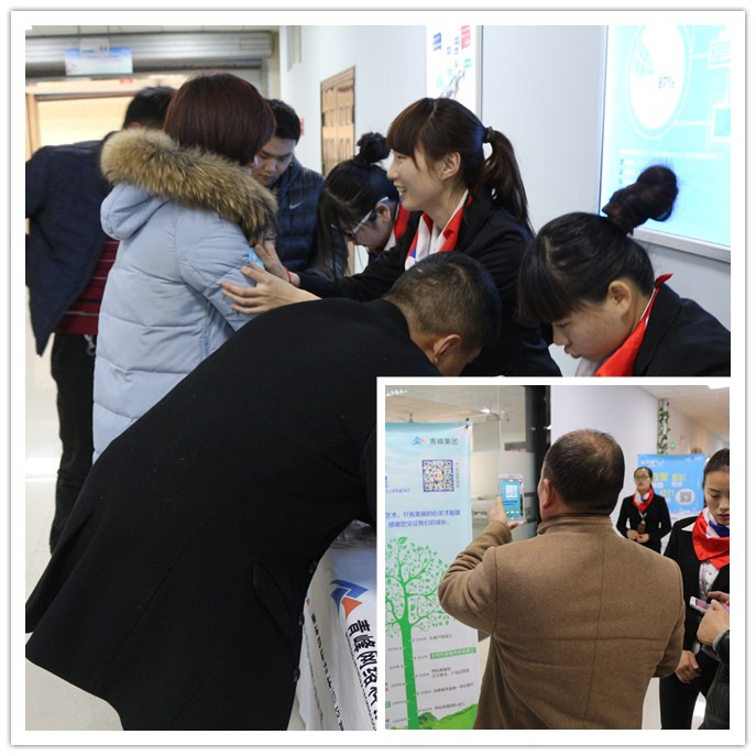 工作人員為每位到場的客戶貼上青峰集團(tuán)的標(biāo)簽并幫助客戶掃描微信獲得第一手網(wǎng)站咨詢